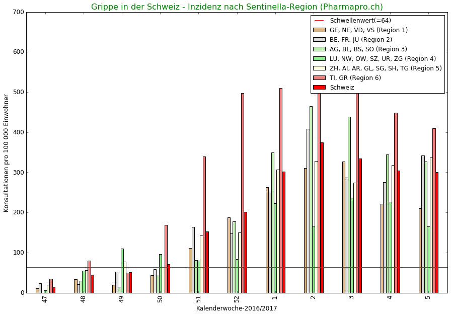 Die Sentinella-Grippe-Überwachung unterteilt die Schweiz in 6 geographische Regionen: 1 (GE/NE/VD/VS), 2 (BE/FR/JU). 3 (AG, BL, BS, SO)\, 4 (LU, NW, OW, SZ, UR, ZG), 5 (AI, AR, GL, SG, SH, TG, ZH) und 6 (GR, TI). Die am meisten betroffene Region mit 410 Fällen ist die Region Süden.